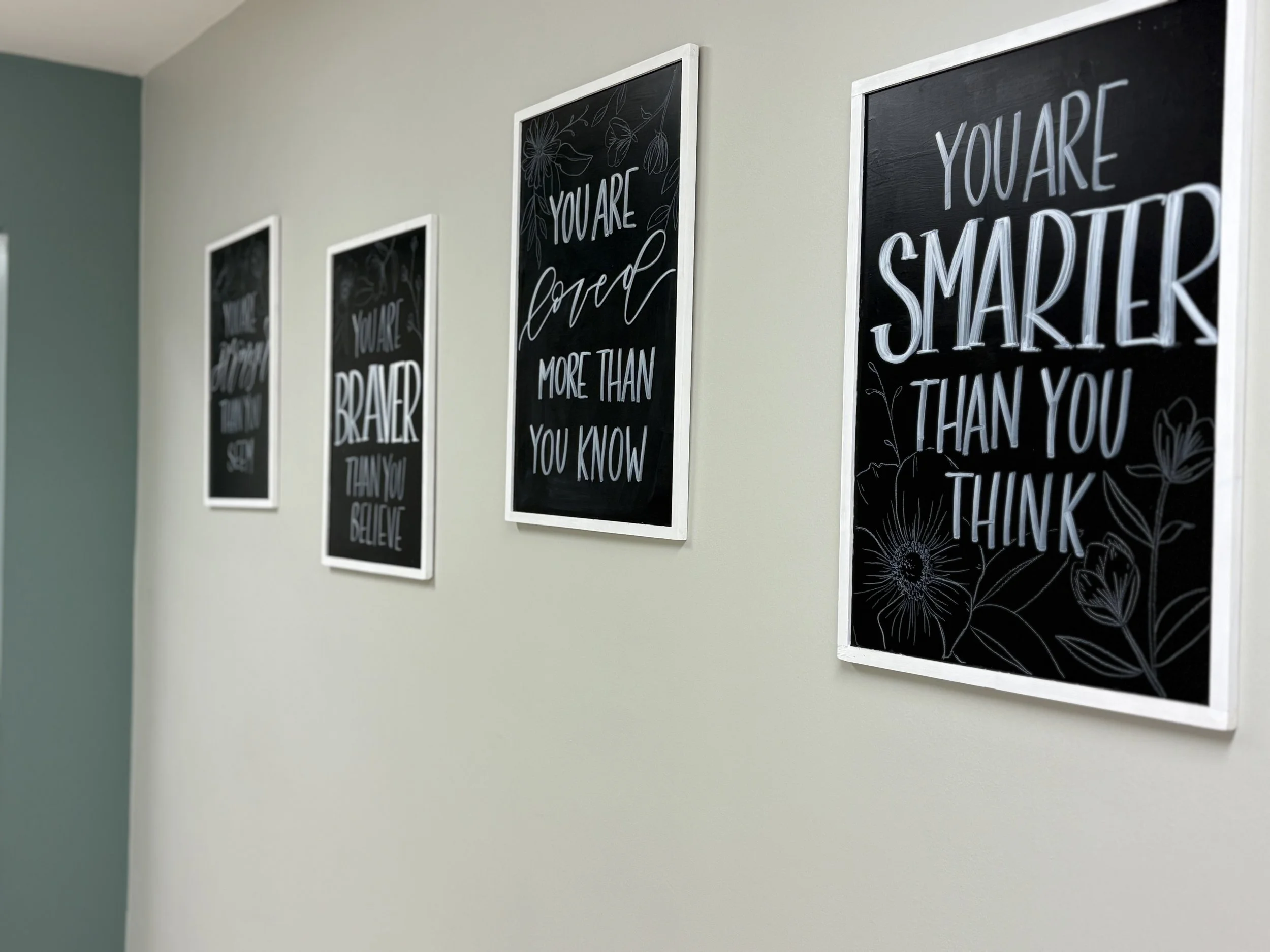 Just off the waiting room is the hallway that leads to the ultrasound room, patient restrooms, the diaper room, and the boutique. Encouraging words adorn the hallway.
